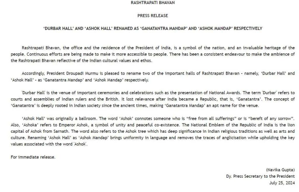 बयान में कहा गया, “तदनुसार, राष्ट्रपति द्रौपदी मुर्मू को राष्ट्रपति भवन के दो महत्वपूर्ण कक्षों—‘दरबार हॉल’ और ‘अशोक हॉल’—का नाम बदलकर क्रमशः ‘गणतंत्र मंडप’ और ‘अशोक मंडप’ करने में प्रसन्नता हो रही है।”